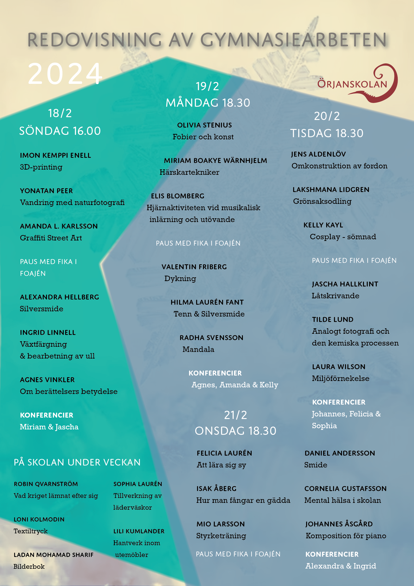 I år har skolan valt att göra en medveten satsning på att stärka och upprätthålla detta arbete. För att kunna ge lärare, elever och även föräldrar förutsättningar att skapa har skolan valt att allokera resurser för en kulturbärande tjänst. En tjänst som är tänkt att hjälpa till att bära det stundtals intensiva arbetet som redan utförs av alla oss som skapar kulturplatsen Örjanskolan.