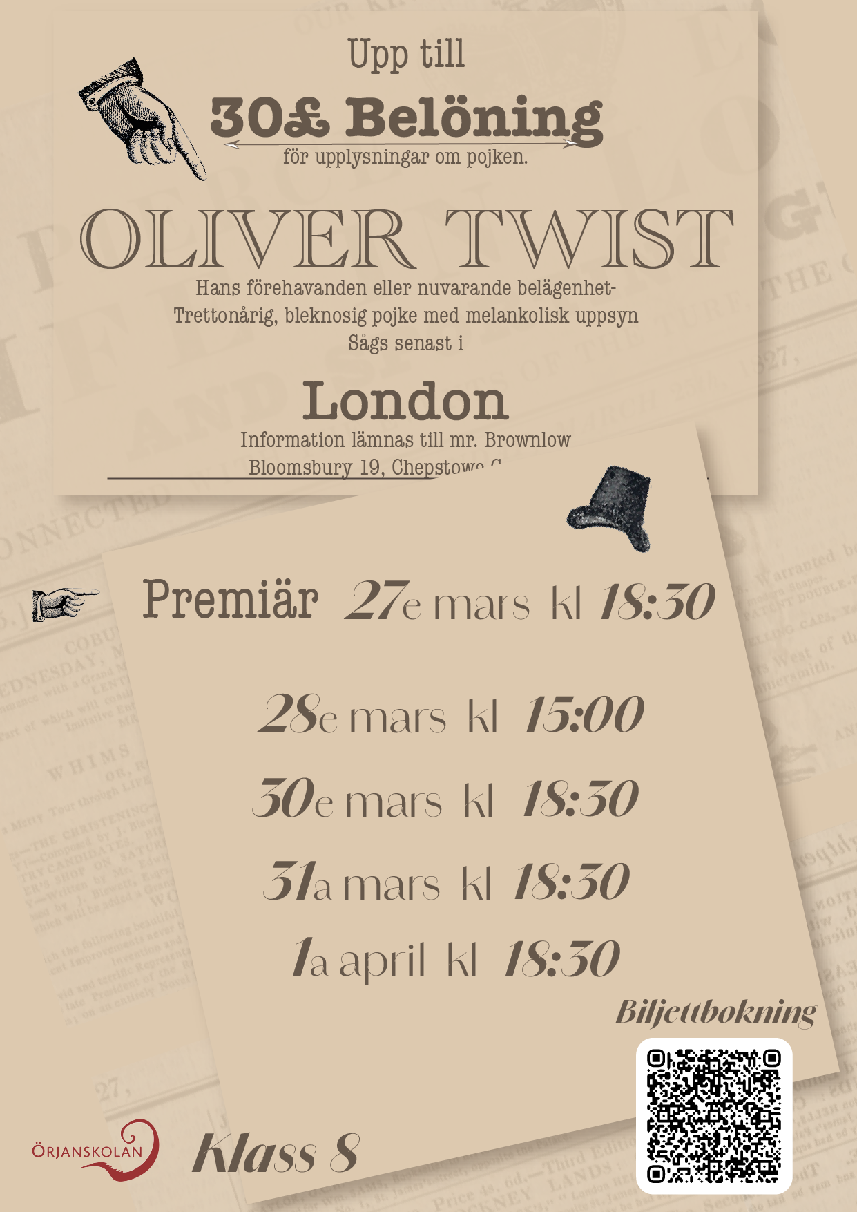 Fredag den 27e mars slår klass 8 upp portarna till sitt framförande av Oliver Twist!